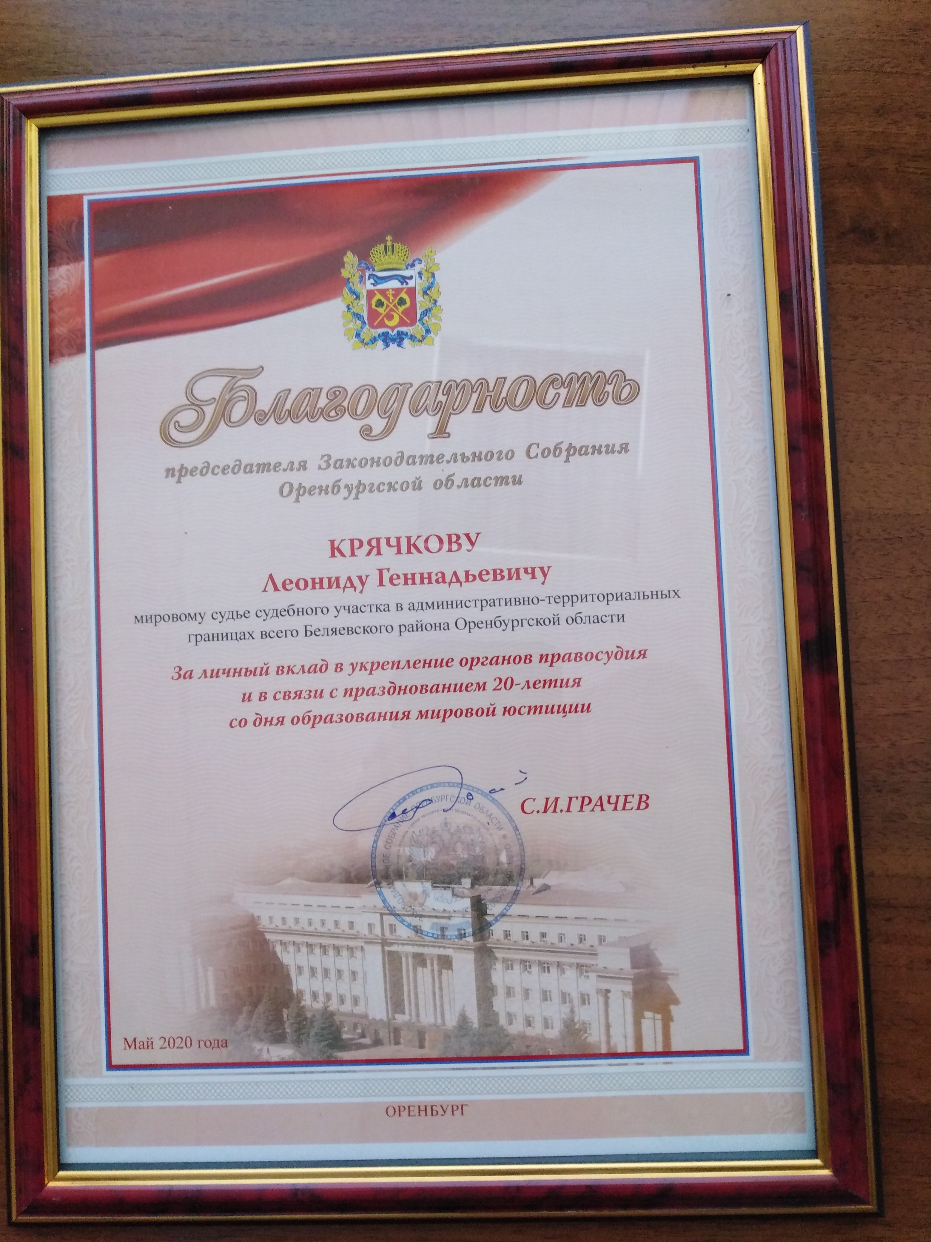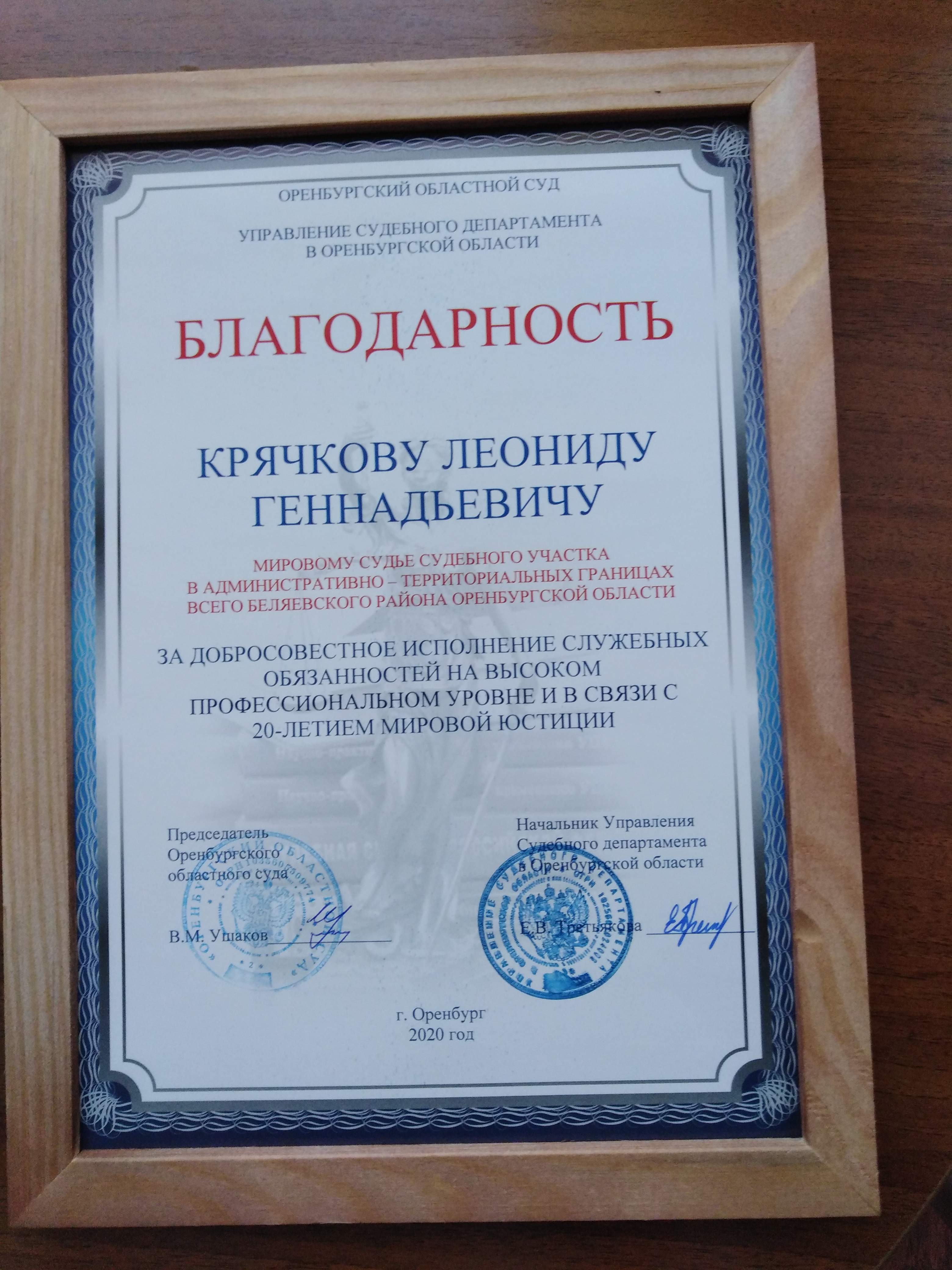 28 августа 2020 года на общем собрании коллективов Беляевского районного суда и судебного участка Беляевского района мировому судье Крячкову Леониду Геннадьевичу были вручены Благодарность председателя Законодательного Собрания Оренбургской области за личный вклад в укрепление органов правосудия и в связи с празднованием 20-летия со дня образования мировой юстиции, Благодарность Управления судебного департамента в Оренбургской области за добросовестное исполнение служебных обязанностей на высоком профессиональном уровне, и медаль «20 лет мировой юстиции Российской Федерации»; в его адрес было сказано много добрых и сердечных слов.